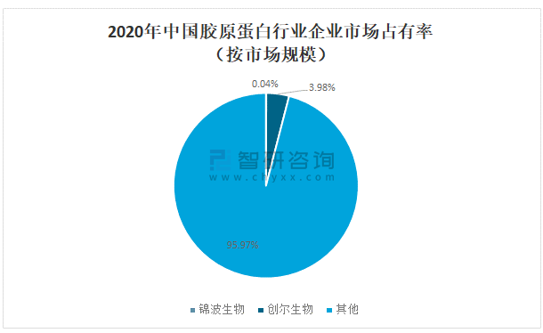 2020年錦波生物膠原蛋白產品業務收入占全國膠原蛋白市場規模的0.04%;創爾生物膠原蛋白產品業務收入占全國膠原蛋白市場規模的3.98%。2020年錦波生物和創爾生物膠原蛋白產品業務收入總和占全國膠原蛋白市場規模的4.03%,企業市場占有率較低,市場格局較為分散。