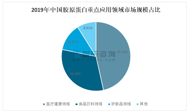 中國膠原蛋白主要應用領域為醫療健康市場,2019年膠原蛋白醫療健康領域市場規模占46.53%,占比最大;食品飲料領域市場規模占31.68%;護膚品領域市場規模占12.87%。