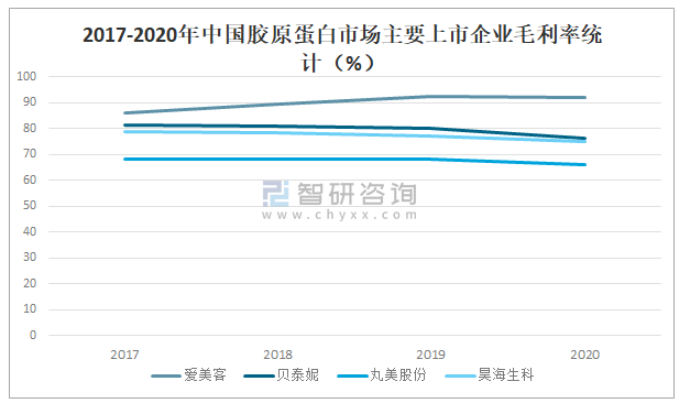 2017-2020年中國膠原蛋白市場主要上市企業毛利率統計(%)