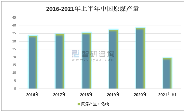 2016-2020年期間,中國原煤產(chǎn)量逐年增長,截至2020年底,中國原煤產(chǎn)量39.02億噸,同比增長1.5%,較2016年底增長4.91億噸;2021年上半年,中國原煤產(chǎn)量19.5億噸,同比增長6.4%。