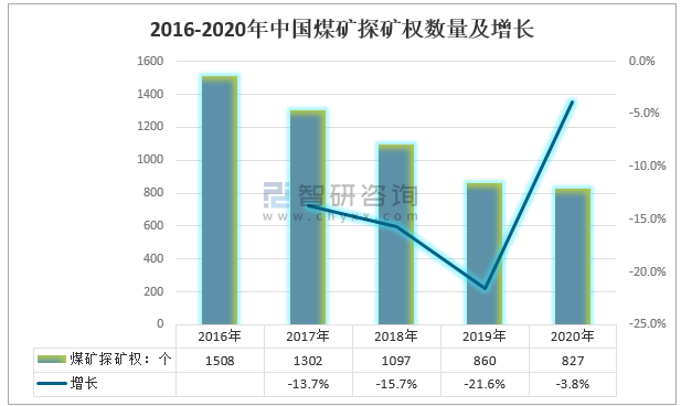 2016年以來,中國煤礦探礦權(quán)逐年減少,截止2020年底,中國有煤礦探礦權(quán)827個,較2019年減少33個,同比下降3.8%。