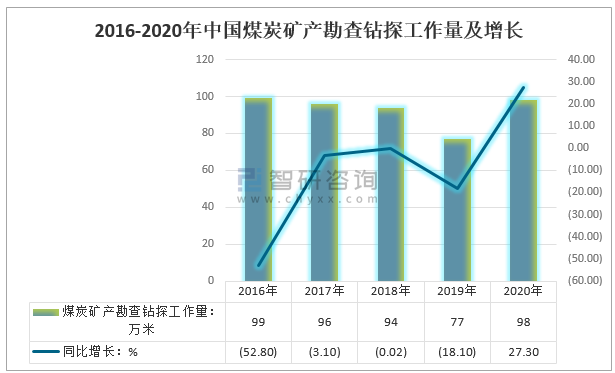 2016-2020年中國煤炭礦產(chǎn)勘查鉆探工作量及增長