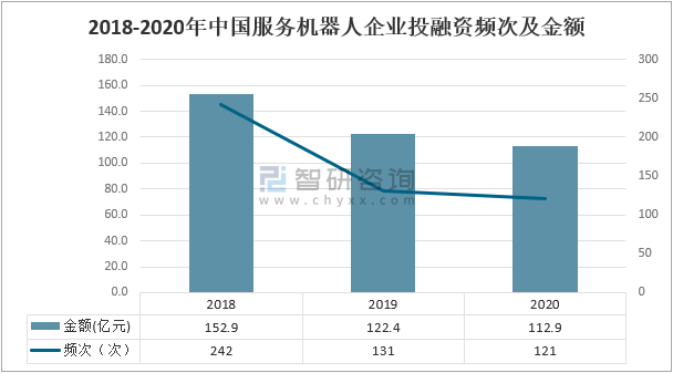 智研咨詢發布的《2021-2027年中國服務機器人行業市場發展模式及未來前景分析報告》數據顯示:2020年中國服務機器人企業投融資頻次為121次,融資金額共112.9億元。