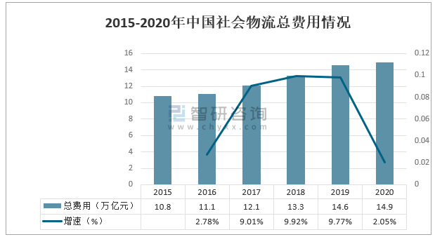 智研咨詢發布的《2021-2027年中國智能化分揀系統產業發展動態及市場前景趨勢報告》數據顯示:物流是國家經濟發展的重要基礎設施,是連接生產、分配、消費不可或缺的服務,2015-2020年中國社會物流總費用持續增長,2020年,我國社會物流總費用達到14.9萬億。