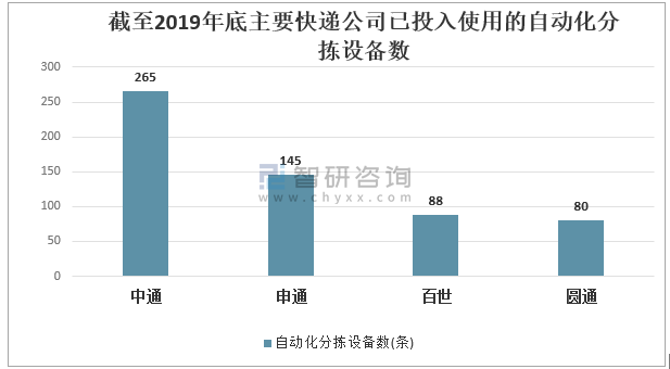 截至2019年底主要快遞公司已投入使用的自動化分揀設備數