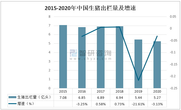 智研咨詢發布的《2021-2027年中國生豬養殖產業發展態勢及投資決策建議報告》數據顯示:全國各地統籌推進疫情防控和農業生產發展,全力落實生豬穩產保供政策措施,生豬產能快速恢復,出欄降幅明顯收窄。2020年,中國生豬出欄量5.27億頭,較上年減少0.17億頭,同比下降3.13%。