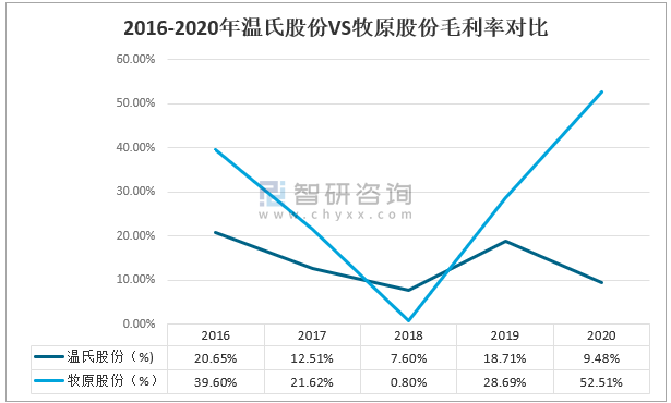 2016-2020年溫氏股份VS牧原股份毛利率對比