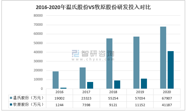 2016-2020年溫氏股份VS牧原股份研發投入對比