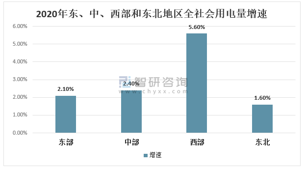 2020年東、中、西部和東北地區全社會用電量增速