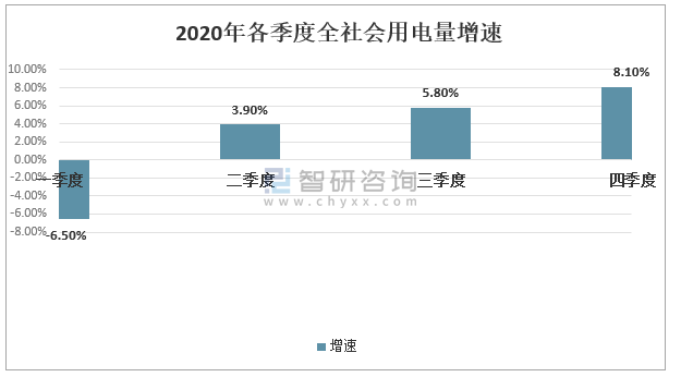 智研咨詢發布的《2021-2027年中國電力行業市場行情動態及投資前景分析報告》數據顯示:根據中國電力企業聯合會數據,2020年,各季度全社會用電量增速分別為-6.5%、3.9%、5.8%、8.1%,經濟運行穩步復蘇是用電量增速回升的最主要原因。全社會用電量季度增速變化趨勢,反映出隨著疫情得到有效控制以及國家逆周期調控政策逐步落地,復工復產、復商復市持續取得明顯成效,國民經濟持續穩定恢復。