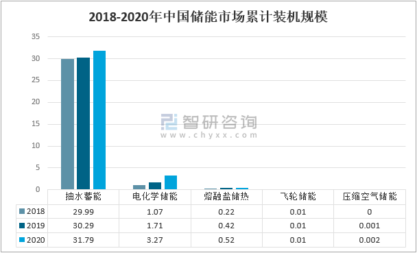2020年,抽水蓄能的累計裝機規模31.79GW,占中國儲能裝機規模的89.3%;電化學儲能的累計裝機規模3.27GW,占中國儲能裝機規模的9.2%;熔融鹽儲熱的累計裝機規模0.52 GW,占中國儲能裝機規模的1.5%;壓縮空氣儲能的累計裝機規模0.01 GW,占中國儲能裝機規模的0.03%。