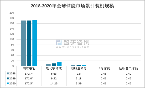 智研咨詢發布的《2021-2027年中國儲能行業競爭格局分析及發展趨勢預測報告》數據顯示:截至2020年底,全球已投運儲能項目累計裝機規模191.06GW,較上年增加6.44 GW,同比增長5.2%。其中,抽水蓄能累計裝機規模172.54GW,同比增長0.9%;電化學儲能累計裝機規模14.25GW,同比增長49.68%;熔融鹽儲熱累計裝機規模3.39 GW,同比增長6.6%。