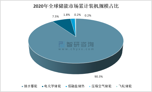 2020年,抽水蓄能累計裝機規模172.54GW,占全球儲能裝機規模的90.3%;電化學儲能累計裝機規模14.25GW,占全球儲能裝機規模的7.5%;熔融鹽儲熱累計裝機規模3.39 GW,占全球儲能裝機規模的1.8%;飛輪儲能累計裝機規模0.46 GW,占全球儲能裝機規模的0.2%。