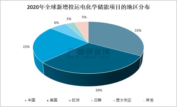 2020年全球新增投運電化學儲能項目的地區分布