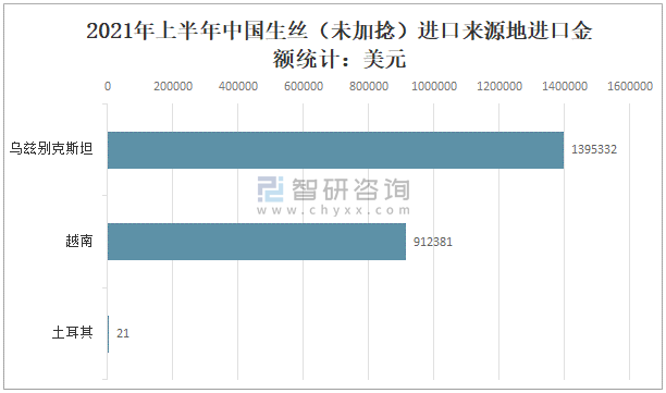 從進口來源國家/地區(qū)來看,2021年上半年中國從烏茲別克斯坦進口生絲(未加捻)的進口金額為1395332美元;從越南進口生絲(未加捻)的進口金額為912381美元;從土耳其進口生絲(未加捻)的進口金額為21美元。