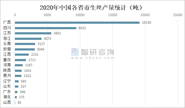 分省市來看,2020年廣西生絲產(chǎn)量為19150噸,全國排名第一;四川生絲產(chǎn)量為9422噸,全國排名第二;江蘇生絲產(chǎn)量為5601噸,全國排名第三。