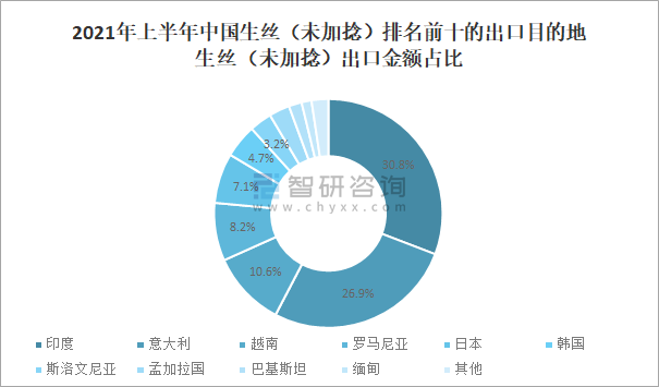 2021年上半年中國生絲(未加捻)排名前十的出口目的地生絲(未加捻)出口金額占比