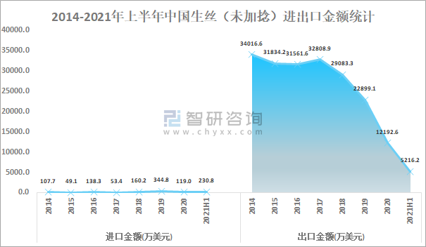 2014-2021年上半年中國生絲(未加捻)進出口金額統(tǒng)計