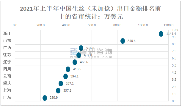 2021年上半年中國生絲(未加捻)出口金額排名前十的省市統(tǒng)計:萬美元