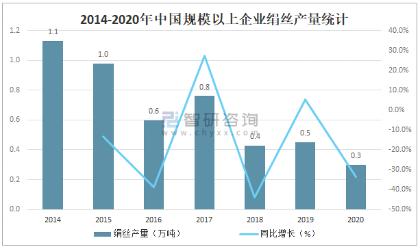 中國生絲有悠久的歷史,現(xiàn)代的產(chǎn)量占世界首位,但自2016年起中國生絲產(chǎn)量開始逐年下滑,2020年中國規(guī)模以上企業(yè)生絲產(chǎn)量為5.3萬噸,較2019年減少了1.56萬噸,同比減少22.7%。