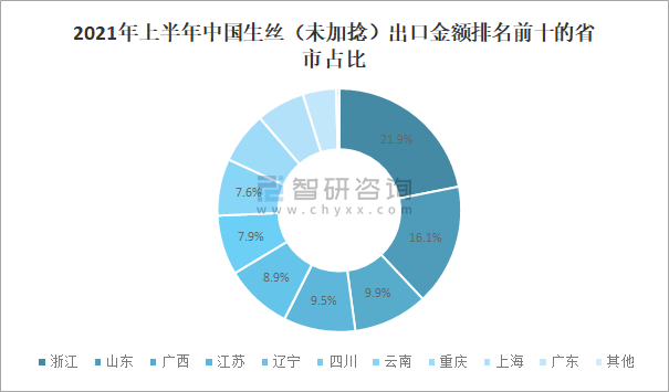 2021年上半年中國生絲(未加捻)出口金額排名前十的省市占比