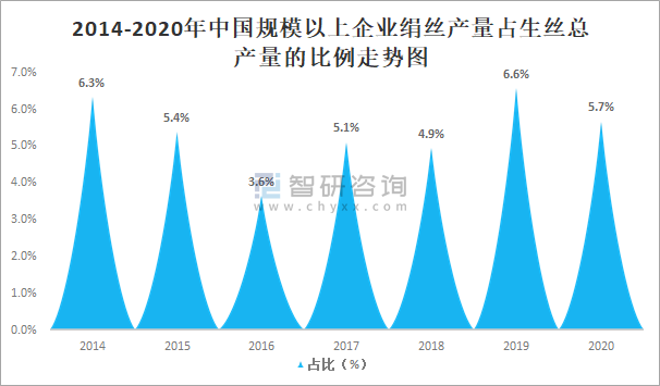 自2017年起中國規(guī)模以上企業(yè)絹絲產(chǎn)量占生絲總產(chǎn)量的5%左右的比例,2020年中國規(guī)模以上企業(yè)絹絲產(chǎn)量占生絲總產(chǎn)量的5.7%,較2019年減少了0.9%。