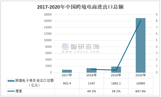 智研咨詢發布的《2022-2028年中國跨境電商行業投資潛力分析及發展前景展望報告》數據顯示:跨境電商依托網絡非接觸交易,受疫情負面影響較小,同時受疫情影響,部分線下交易轉至線上,帶動中國跨境電商蓬勃發展;2020年,中國跨境電商進出口總額達到16900億元,較2019年的1862.1億元同比增長807.6%。