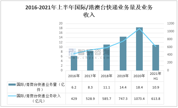 近年來,中國國際/港澳臺快遞業務快速增長,2021年上半年,國際/港澳臺快遞業務量完成10.9億件,同比增長43.1%,業務收入完成613.8億元,同比增長33.2%。