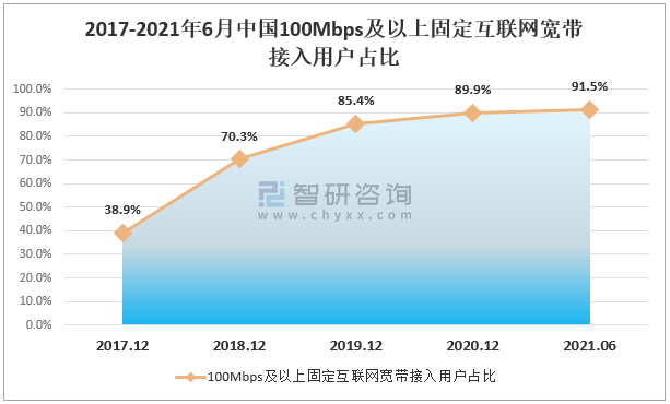 2017-2021年6月中國100Mbps及以上固定互聯網寬帶接入用戶占比