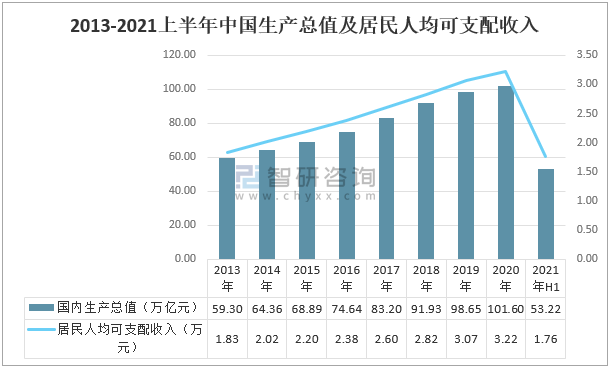 2013-2021上半年中國生產總值及居民人均可支配收入