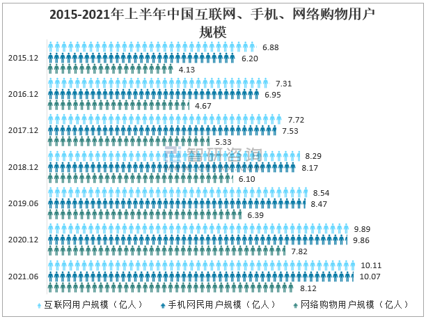 2015-2021年上半年中國互聯網、手機、網絡購物用戶規模