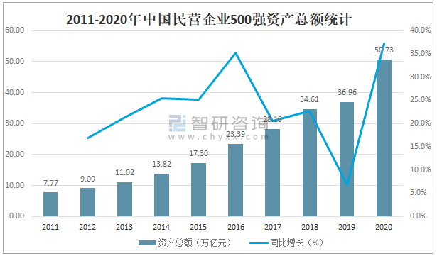從資產總額來看,截止2020年末,中國民營企業500強資產總額達50.73萬億元,較2019年增加了13.77億元,同比增長37.3%。