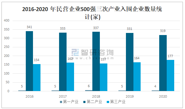 2016-2020年民營企業500強三次產業入圍企業數量統計