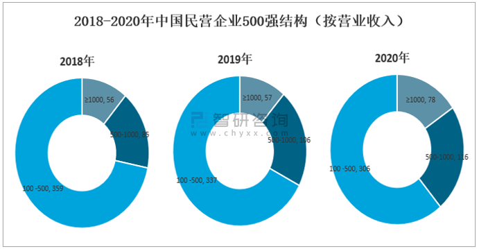 2018-2020年中國民營企業500強結構(按營業收入)