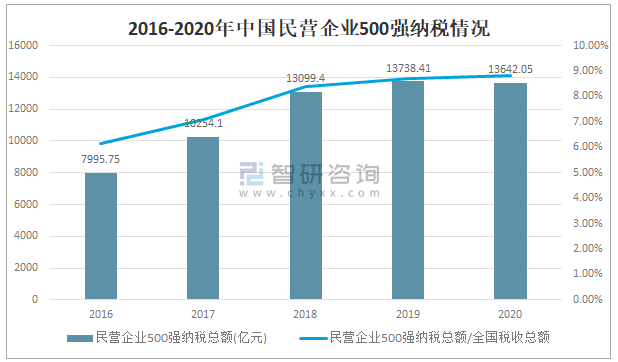隨著國家持續加大減稅降費力度,民營企業500強納稅總額較上年略有減少,但占全國稅收總額20的比重繼續提升。2020年中國民營企業500強納稅總額達13642.05億元,占全國稅收總額的比重為8.84%。