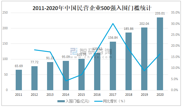 近年來中國民營企業500強整體規模持續增長,2020年中國民營企業500強入圍門檻達235.01億元,較2019年增加了32.97億元,同比增長16.3%。