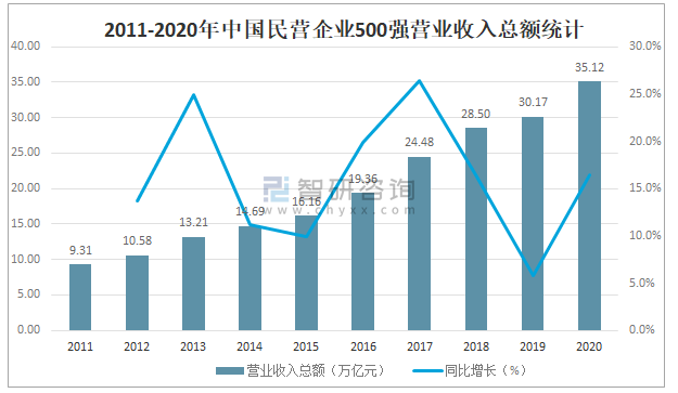 從營業收入總額來看,2020年中國民營企業500強營業收入總額達35.12萬億元,較2019年增加了4.95萬億元,同比增長16.4%。