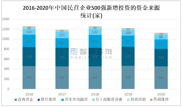 2016-2020年中國民營企業500強新增投資的資金來源統計(家)