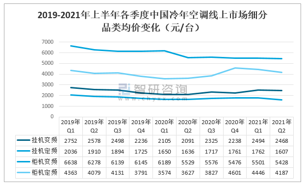 2019-2021年上半年各季度中國冷年空調(diào)線上市場細分品類均價變化(元/臺)