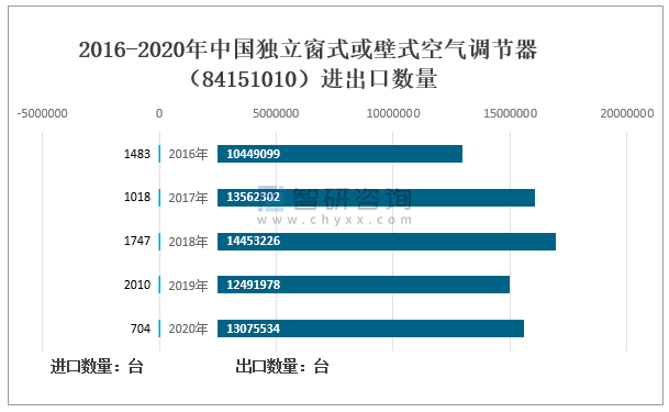中國是全球最大的空調(diào)出口國。2016-2020年期間,中國獨立窗式或壁式空氣調(diào)節(jié)器(84151010)出口數(shù)量遠遠大于進口數(shù)量,2020年中國獨立窗式或壁式空氣調(diào)節(jié)器(84151010)出口數(shù)量13075534臺,較2019年增長583556臺;而進口數(shù)量704臺,較2019年下降1306臺。