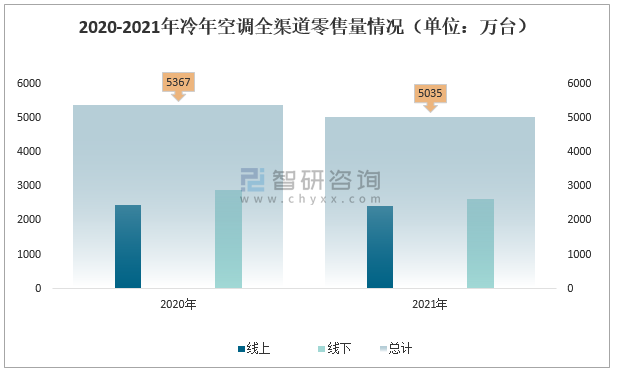 2020-2021年冷年空調(diào)全渠道零售量情況(單位:萬臺)