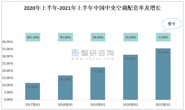 2020年上半年-2021年上半年中國中央空調(diào)配套率及增長