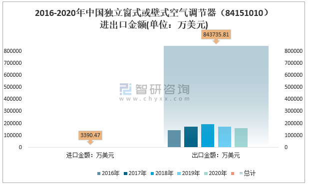 2016-2020年中國獨立窗式或壁式空氣調(diào)節(jié)器(84151010)進出口金額(單位:萬美元)