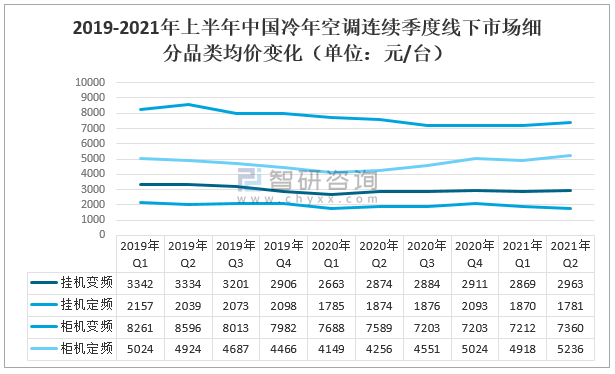 2019-2021年上半年中國冷年空調(diào)連續(xù)季度線下市場細分品類均價變化(單位:元/臺)