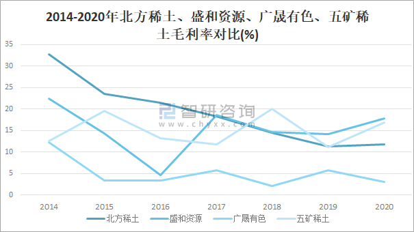 2014-2020年北方稀土、盛和資源、廣晟有色、五礦稀土毛利率對比(%)