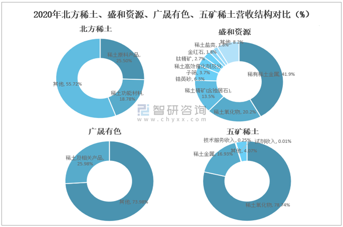 2020年北方稀土、盛和資源、廣晟有色、五礦稀土營收結構對比(%)