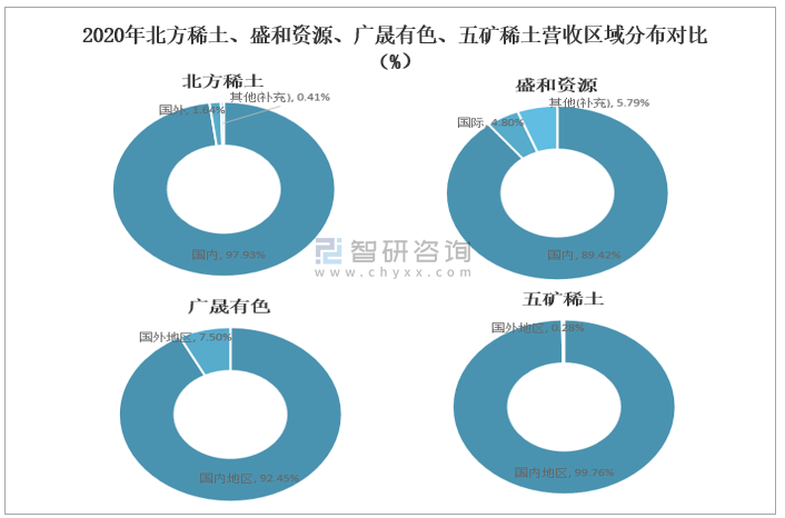 2020年北方稀土、盛和資源、廣晟有色、五礦稀土營收區域分布對比(%)