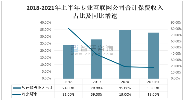 2018-2021年上半年專業互聯網公司合計保費收入占比及同比增速