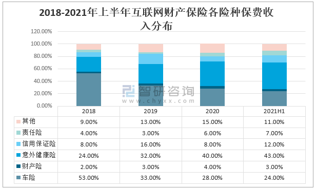 2018-2021年上半年互聯網財產保險各險種保費收入分布