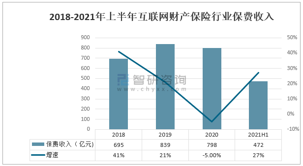 2018-2021年上半年互聯網財產保險行業保費收入持續增長,2021年上半年,互聯網財產保險市場累計實現保費收入472億元,同比增長27%。